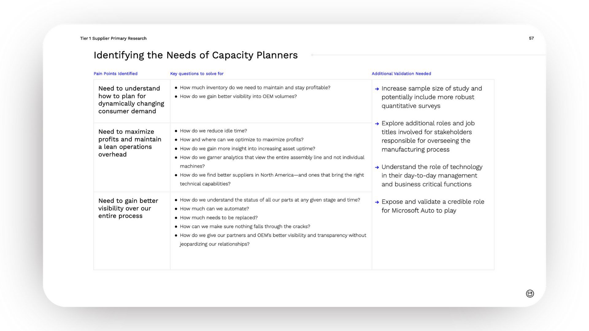The research revealed that Tier 1 suppliers are increasingly seeking solutions that can offer both immediate ROI and long-term strategic benefits. Key pain points included the need for better data integration and a more collaborative approach with OEMs. The study identified two main groups of stakeholders: Change Drivers, focused on strategic business transformation, and Capacity Planners, who manage the immediate operational challenges.